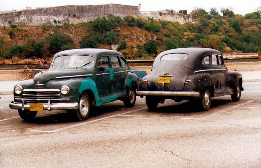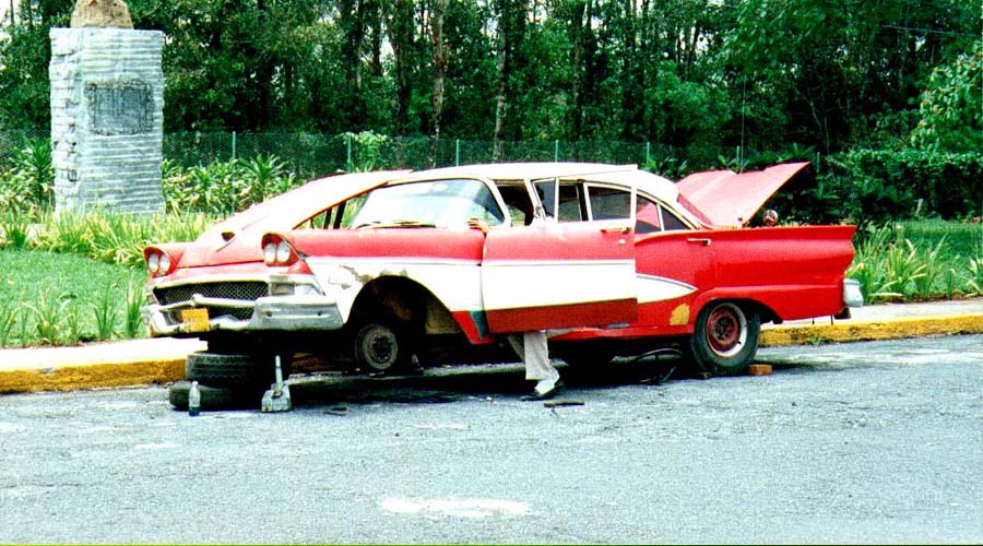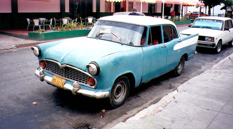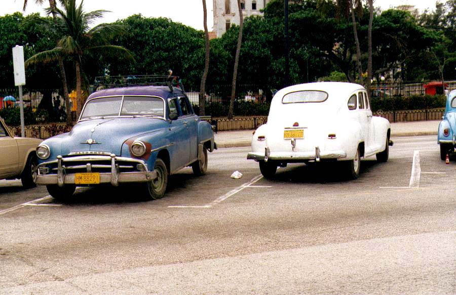 Bricoleurs de génie, les Cubains réussissent encore à faire marcher des voitures qui datent de la grande époque d'Hemmingway. Je ne me suis pas donné la peine de rechercher toutes les marques et les modèles ; ceux qui s'y connaissent les identifieront. Et dans le lot se glisseront des modèles européens : des Austins entre autres, une Fiat, une Volvo et chez les françaises une Frégate Renault et une Simca Versaille ... Alors en route dans les années 50-60 ... |
