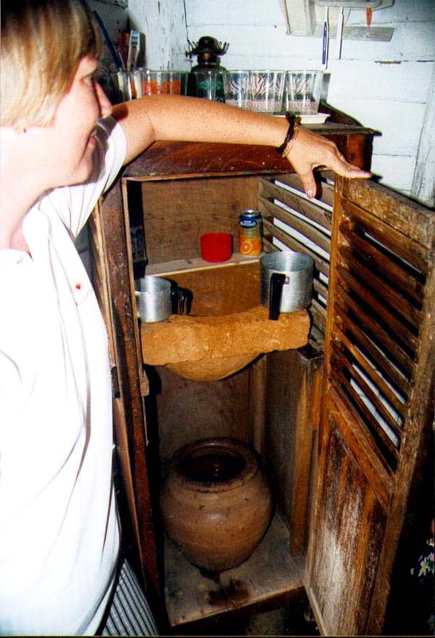 | Chez cette petite paysannerie, le confort est relatif et l'équipement électro-ménager est minimal. On nous a donc présenté le "frigidaire de campagne" dont le principe repose sur la ventilation naturelle d'un bassin d'eau en pierre. C'est rudimentaire, mais si on juge par le contenu du frigidaire, ça permet au moins d'avoir de l'eau fraîche ! |