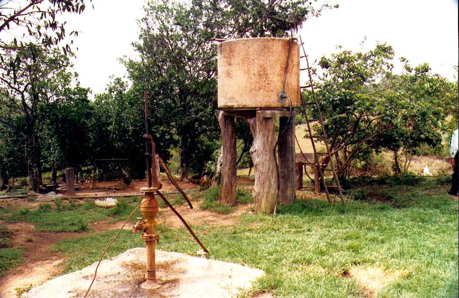 | Nous visitons ensuite le reste de l'exploitation avec ses divers équipements : la petite case pour l'outillage, le château d'eau |