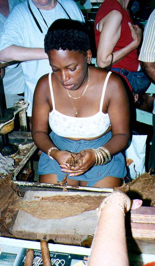 | Le groupage. Etant donné que tel jour, on travaille pour telle marque, il s'agit ici de grouper les cigares par couleur de façon avoir des boîtes homogènes. En toute simplicité, cette jeune et jolie ouvrière m'a clairement dit que si je la prenais sur mon passeport, elle me suivrait volontier en France ... et je ne pense pas que cela tienne à mon formidable et légendaire sex appel ... plutôt l'envie de pouvoir s'échapper vers une vie plus facile et plus libre ... |