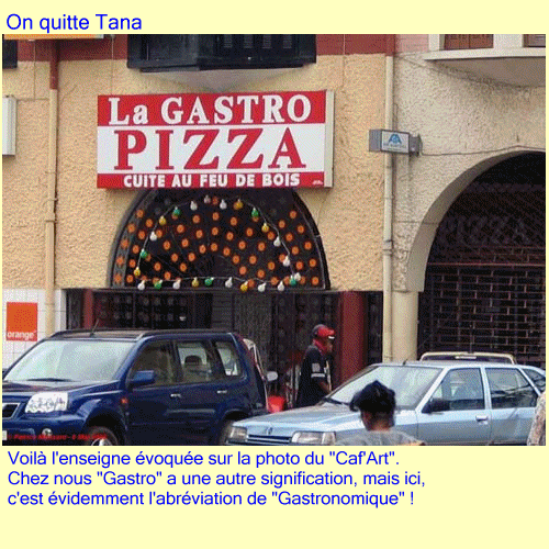 Sur la RN 2. Avenue Andrianampoinimerina et le Lycée J.J Rabearivelo, le petit lac rond-point de Behoririka, le quartier Andravoahangy Ambany, Besarety et nous voilà dans la campagne. L'air devient plus pur car de nombreux bosquets d'eucalyptus bordent la RN 2 ; hélas, on croise fréquemment des files de camions à l'échappement malodorant. Ce n'est pas tous les jours : cela dépend en effet de l'arrivée de cargos à Tamatave car la RN 2 est le seul trajet possible entre Tana et Tamatave et les trains ne circulent plus sur cette ligne. On fait évidemment quelques arrêts photos car il y a des points de vue qu'il ne faut pas louper. Cela nous donne aussi l'occasion d'admirer quelques agriculteurs qui ont entrepris de refaire les bordures des rizières en escalier ; ils travaillent à l'angady, bien sûr. Quel boulot ! Quel courage ! On traverse Manjakandrina ... une fourmilère. Sur la droite, l'embranchement pour Mantasoa ... ce sera pour le prochain voyage ! Et puis c'est la Mandraka ; la région change peu comme on peut le voir avec la photo de 1956 ... La descente de la falaise de l'Angavo qui donne sur Anjiro est toujours impressionnante, bien que la route soit sans comparaison avec ce qu'elle était en 56 et en tout cas, beaucoup moins dangereuse. Marozevo. C'est une étape classique sur ce trajet : la réserve animalière présente une grande variété de caméléons (j'ai mis beaucoup de photos prises en 2001), de papillons et d'autres espèces endémiques de Madagascar. Cette fois-ci, Martine a vaincu son apréhension et a consenti à se laisser approcher par un caméléon.. Moramanga. Sakafo prévu chez le chinois : Le Coq d'Or. Je sais, ça ne fait pas très chinois comparé aux habituelles "Muraille de Chine", "Jardin de trucs de machins d'orients" ou autres bidules de Jade ! Mais voilà : au Coq d'Or, on peut manger de vrais sambos ... les meilleurs de Mada ... de ceux qui ont encore ce goût de ceux de ma jeunesse ... j'en parle toute la matinée et tout le monde en a l'eau à la bouche ... midi, on touche au but. Damned! C'est raté :, aujourd'hui, il n'y en a plus ! La plupart du temps, il fait toujours très chaud dans la plaine de l'Ankay ; c'est particulièrement le cas aujourd'hui et à midi, tout Moramanga semble s'endormir, à l'instar de ce tireur de pousse-pousse qui récupère peut-être d'une dure matinée ! à suivre : De Moramanga à Andasibe |