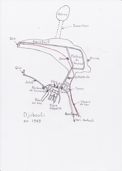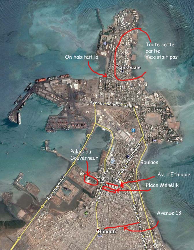 Personnellement, je ne connais pas cette appellation de "Plateau du Serpent". Dans les années 50, c'était connu comme "Le Plateau", "Le Marabout" ou pour ceux qui s'en donnaient la peine : "Le Plateau du Marabout". Marabout ou Serpent, d'ailleurs, on se demande bien pourquoi, encore qu'il devait y avoir plus de Marabouts dans les décharges et dans le port que de serpents. D'ailleurs, à cette époque la partie qui reliait le centre ville au plateau était plus étroite que ce que l'on peut voir maintenant sur les images satellites. Quand nous sommes arrivés à Djibouti, nous habitions avenue 13,au premier de la maison à deux étages, en attendant que la société ait terminé les logements qu'elle mettait à disposition de ses employés. |