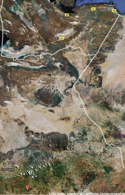 Cette capture satellite pour vous permettre de situer Harar en Ethiopie où nous allions en colo et Dire Dawa la gare sur la ligne Djibouti-Addis Abeba où nous descendions pour continuer ensuite en camion. A Harar, il y avait un super Hôtel-Restaurant italien : le Ciao où on pouvait manger ce plat éthiopien qui est du véritable plomb fondu, tellement ça brûle la gueule : le wat. C'est un plat à base de poulet qui se mange accompagné de galettes de mil dont l'acidité atténue (un peu) le feu de la sauce. Tu connais ça Charles ? Il paraît qu'à Paris, il y a un resto où on peut en manger.