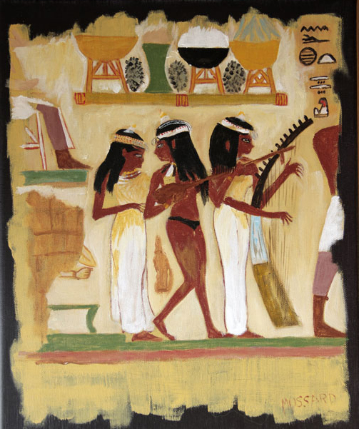 D'après une photo du web. Thème d'exposition annuelle : l'histoire de la mode de l'antiquité à nos jours. J'avais tiré l'Antiquité. C'est un fragment de la fresque murale que j'ai traité façon papyrus. |